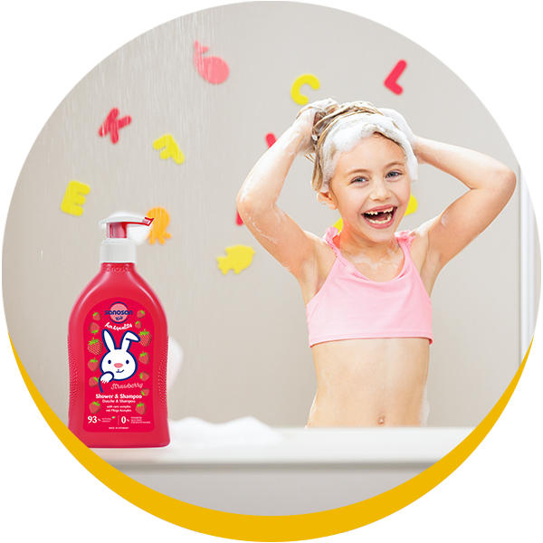 Süßer Erdbeerduft für fröhliche Duscherlebnisse. Sanfte Reinigung und Schutz vor dem Austrocknen. Pflege, der Eltern vertrauen.